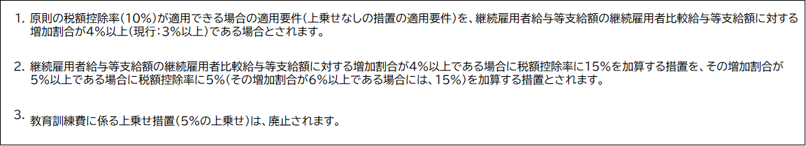 教育訓練費に係る上乗せ措置(10%の上乗せ)は、廃止されます。本改正は、令和8年4月1日以後に開始する事業年度から適用とされる見込みです。