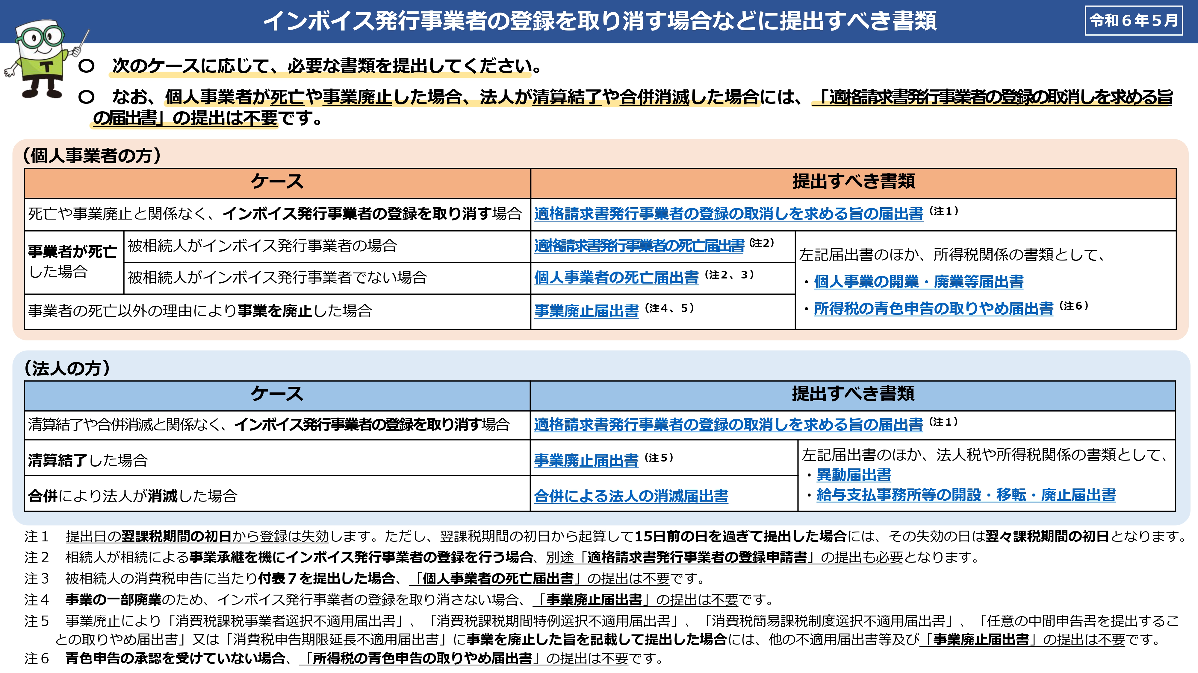なお、インボイスの登録をやめる場合であっても、個人事業者が死亡した場合や、法人が合併により消滅した場合など、登録取消届出書が不要となるケースがあります。国税庁のホームページでは、個人事業者と法人に分けて、死亡や合併といった特殊なケースも含め、インボイス登録をやめる場合にどのような書類を提出すべきかをケース別に整理して解説しています。
