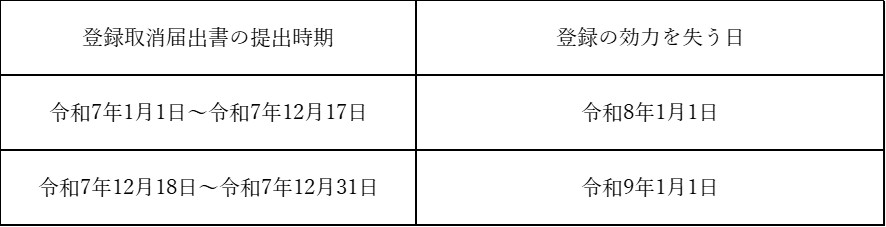 12月決算法人が令和7年中に登録取消届を提出する場合の登録取消届出書の提出時期と、登録の効力を失う日をまとめると次のとおりです。