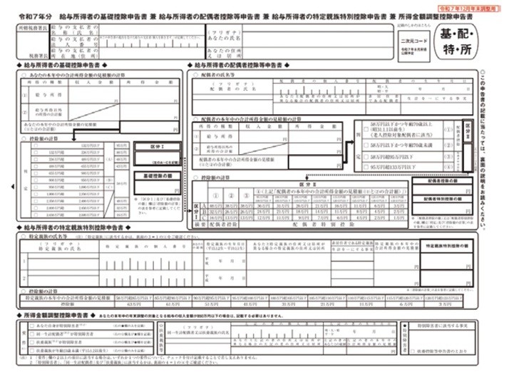 さらに、新たに「特定親族特別控除」が創設されました。一定の要件を満たす特定親族がいる場合、従業員の総所得金額から最大63万円を控除できる制度であり、適用を受けるには「給与所得者の特定親族特別控除申告書」の提出が必要です。これらの改正に対応するため、「給与所得者の基礎控除申告書兼給与所得者の配偶者控除等申告書兼給与所得者の特定親族特別控除申告書兼所得金額調整控除申告書」という新様式が導入されました。基礎控除、配偶者(特別)控除、特定親族特別控除、所得金額調整控除を受けようとする方は、この書類を提出することになります。
