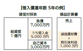 もう一つの重要な指標が、借入金の返済力を表す借入償還年数です。これは、貸借対照表にある借入金の残高を、損益計算書から得られるキャッシュフロー(税引後利益+減価償却費)で割って求めます。つまり「今の稼ぐ力で、借金を何年で返せるか」を示すものです。たとえば借入金が5,000万円で、キャッシュフローが1,000万円なら返済に5年かかります。
