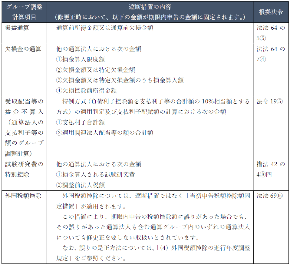 下表では、大通算法人に適用されるグループ調整計算項目ごとに、遮断措置の内容を整理しています。