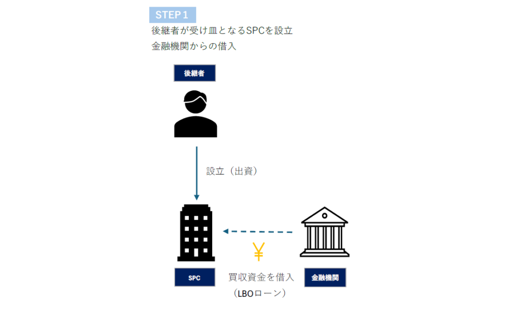 後継者(役員・従業員)は、自己資金や金融機関からの借入れにより、買収対象会社の株式を取得するための特別目的会社(Special Purpose Company、以下「SPC」といいます。)を設立します。設立にあたっては、後継者が買収対象会社株式を買い取る資金の一部を資本金として払い込みます(ファンドやVC からの出資を受ける場合もあります。)。自己資金で不足する買取資金は、SPC が金融機関から借り入れ(LBO ローン)を行い資金を調達します。