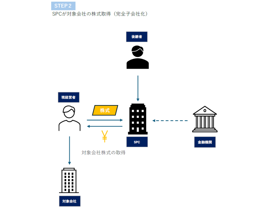 SPC は、現経営者から買収対象会社の株式を取得し、買収対象会社を完全子会社化(100%所有)します。
