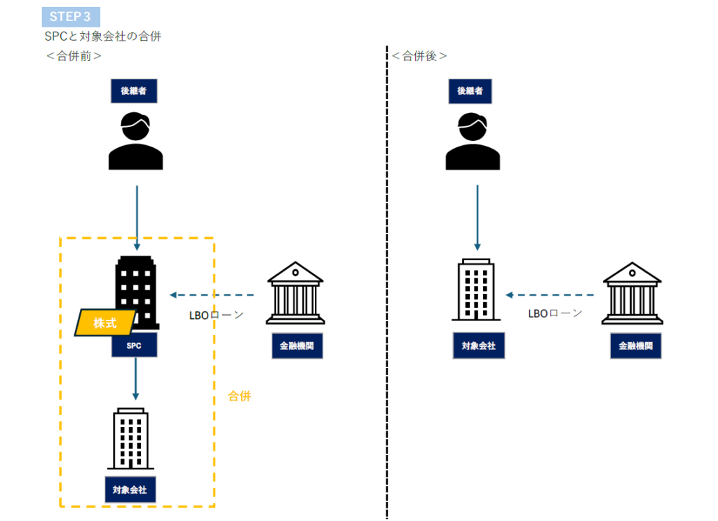 最後に、買収対象会社がSPC を吸収合併します。合併により、SPC が金融機関から調達したLBO ローンは合併後の買収対象会社に引き継がれ、当該LBO ローンの返済義務は合併法人である買収対象会社が負うことになります。これにより、現経営者である創業オーナーから後継者への株式承継が完了します。