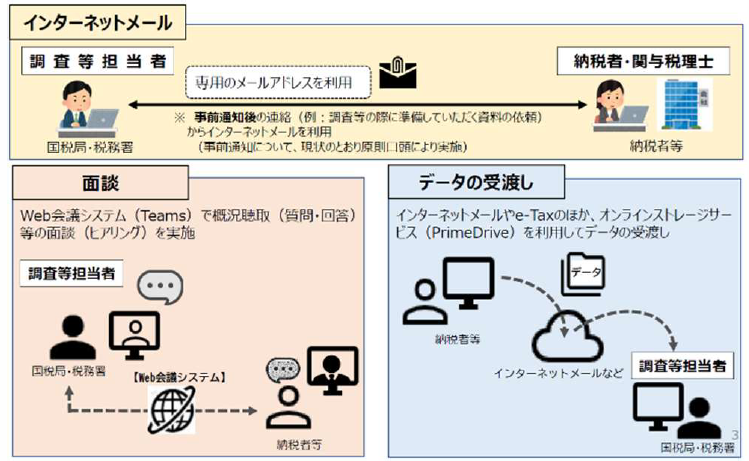 また、オンラインツールは必要に応じて行われるため、連絡はメールで行い、面談は調査官と納税者が直接対面で行うというケースも想定されるようです。