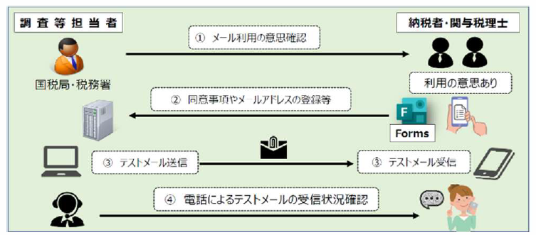 オンライン調査等の実施は強制ではなく、あくまで任意のものであり、利用にあたってはインターネット利用によるリスク等への理解など、事前に納税者の同意を得て進めることになります。インターネットメールの利用を例にとると、国税局・税務署より納税者・関与税理士に対してメール利用の意思確認を行った上で、Microsoft Forms を通じてオンラインツールの利用に関する同意事項等を登録します。その後、テストメールをやり取りし、受信状態を電話で確認することで準備が整います。