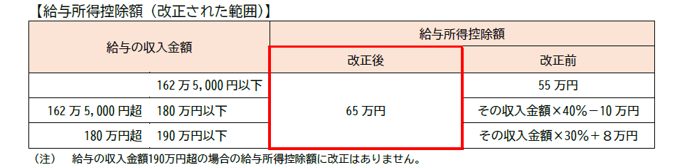 給与所得控除の最低保障額が、55万円から65万円へ引き上げられました。