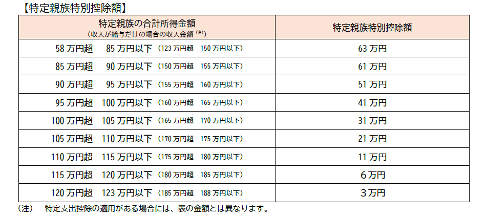 居住者に「特定親族」がいる場合、その居住者の総所得金額等から、特定親族1人につき、その特定親族の合計所得金額に応じて次の金額を控除することができる新制度が設けられました。(特定親族とは、居住者と生計を一にする年齢19歳以上23歳未満の一定の親族で合計所得金額が58万円超123万円以下の人をいいます。)