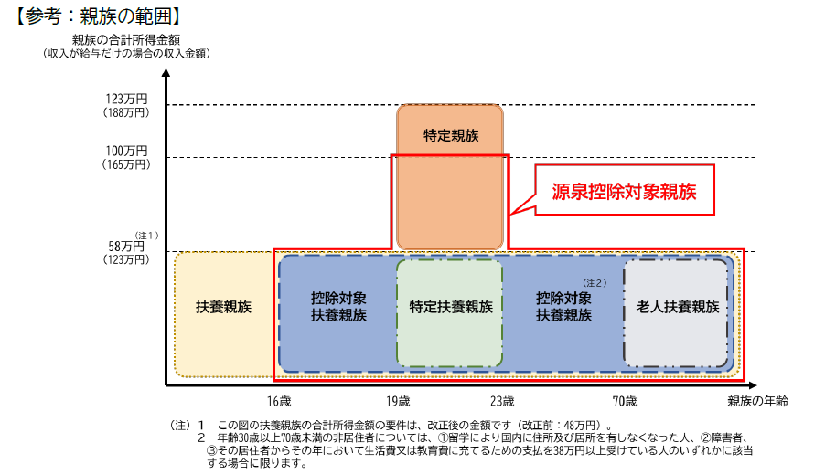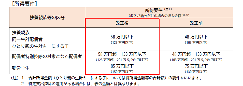 基礎控除の見直しに伴い、扶養親族や配偶者などの所得要件も下表のとおり改正されています。