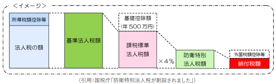 防衛特別法人税の金額は、各事業年度において一定の税額控除を適用する前の法人税額(以下「基準法人税額」という。)から、年500万円(以下「基礎控除額」という。)を差し引いた課税標準法人税額に、4%の税率を乗じて算出します。