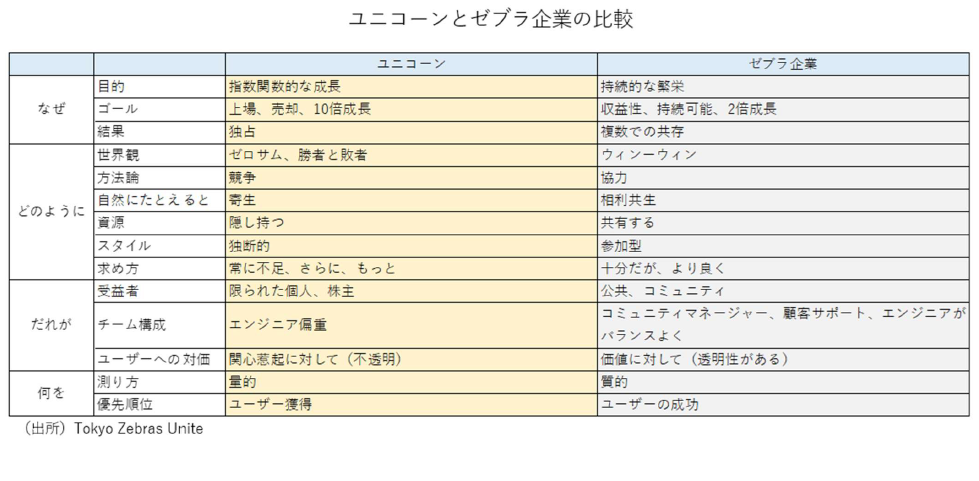 この点は、ユニコーン企業とゼブラ企業との違いからもよくわかります。ゼブラ企業の目的は持続的な繁栄にありますが、その目的を実現するために、企業として「どのように行動するのか」、「だれが価値創造を担うのか」、「何を成果として測るのか」といった構成要素を、あらかじめ細かく、かつ、明確に設計します。