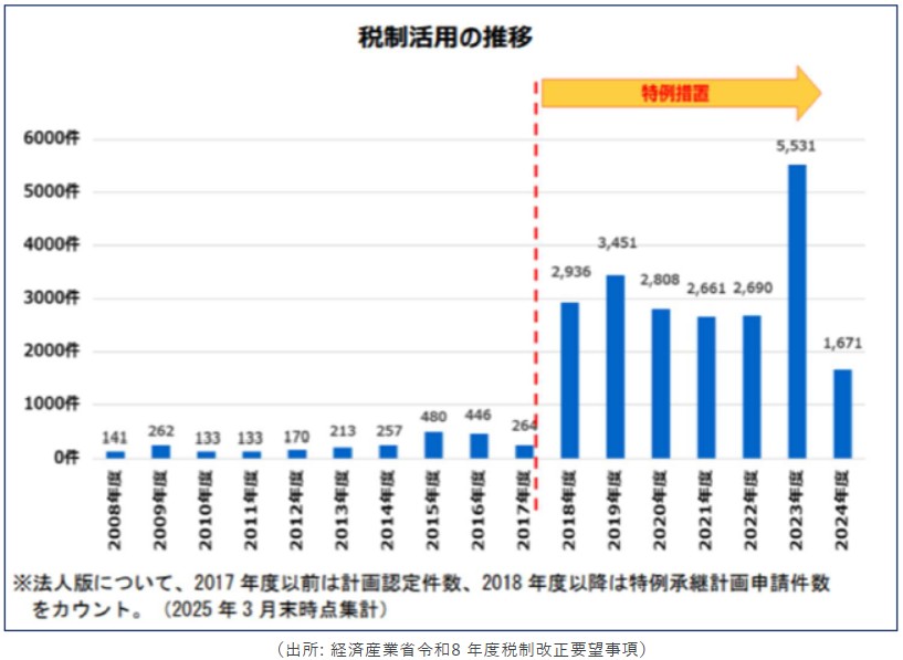 特例措置は、贈与及び相続による株式承継の税負担を「ゼロにする」という画期的な制度であり、これまで多くの中小企業の事業承継を自社株承継(物的承継)の側面からサポートしてきたと言えます。令和8年(2026年)度税制改正要望事項(経済産業省中小企業庁事業環境部財務課)によれば、特例措置に係る特例承継計画の申請件数の推移は次の通りとされています。