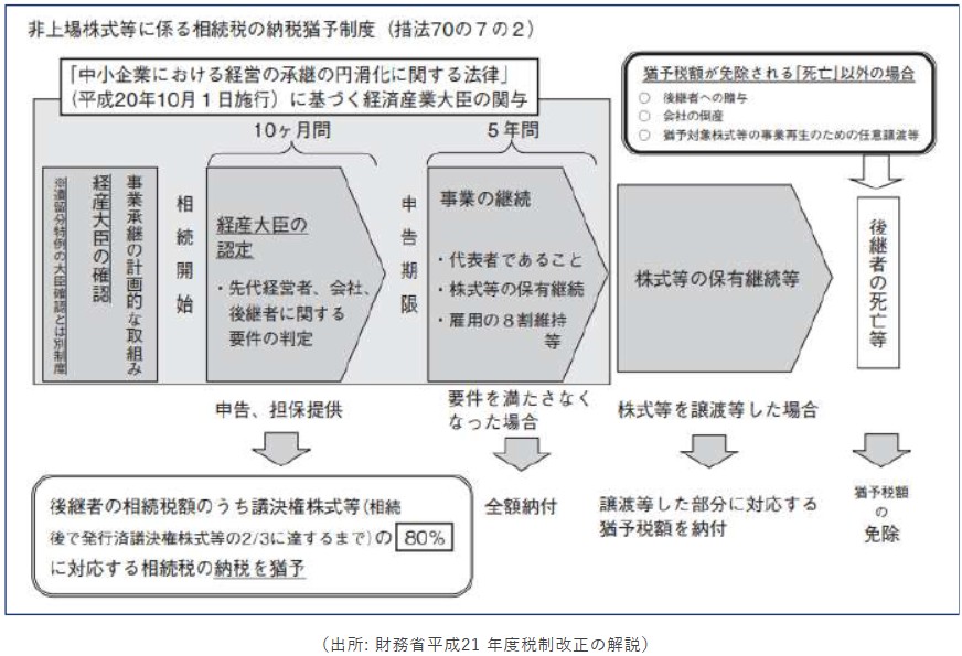 このような課題に対処すべく、2009年度税制改正において一般措置が創設されました。一般措置では、一定の要件を満たせば被相続人から承継した自社株式(発行済議決権株式等の3分の2が限度とされます。)の80%に相当する相続税の納税が猶予されます。