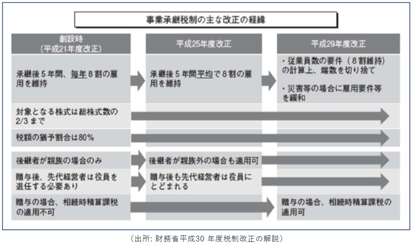 一方で、要件充足のための制約が多く使い勝手も悪いことから一般措置の活用が進んでいない状況の中、同制度の活用促進を図る観点から、2013年度税制改正において、①雇用確保要件の緩和や親族間承継要件の廃止等の「要件の緩和」、②利子税の負担軽減等の「負担の軽減」、③事前確認制度の廃止等の「手続の簡素化」の3つを柱とする抜本的な見直しが行われました。