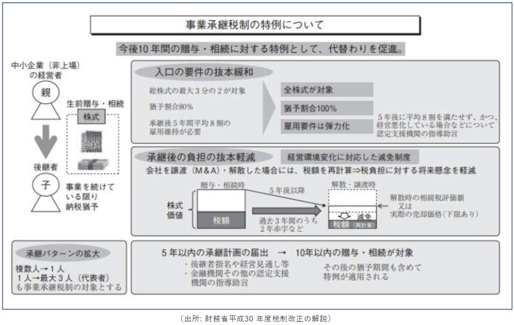 その後、一定程度の活用は見られたものの利用件数が伸び悩む中、中小企業の円滑な世代交代を集中的に促進し生産性向上に資する観点から、一般措置をモデルとして、これを大胆に見直す形で2018年度税制改正において、10年間に限り、贈与及び相続による株式承継を対象とした特例措置が創設されました。