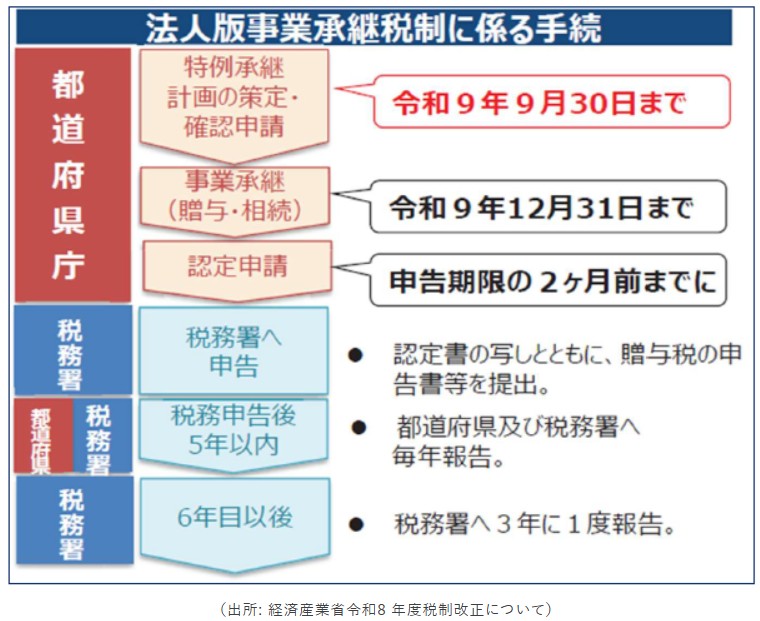 上述の通り、特例措置の適用期限は2027年12月31日とされていることから、本適用期限の到来を見据え早期に事業承継に取り組むことが期待されます。一方、2026年度税制改正において、「適用期限到来後のあり方については、世代交代の停滞や地域経済の成⾧への影響に係る懸念に加えて、本措置の適用状況や課税の公平性等の観点も踏まえて多角的な検討を行い、令和9年度税制改正において結論を得る」と言及されていることから、2027年度税制改正において法人版事業承継税制に関する追加的な改正措置が実施される可能性もあります。