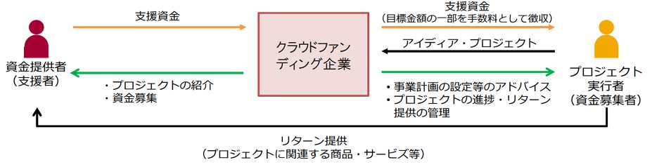 クラウドファンディングとは、インターネットを通じて不特定多数の人々から資金を募る仕組みであり、次のようにアイデアやプロジェクトの実現を目指す個人や団体、企業などが専用のプラットフォーム上(クラウドファンディング企業が提供)で目的や内容を公開し、それに共感した人々が資金で支援を行います。