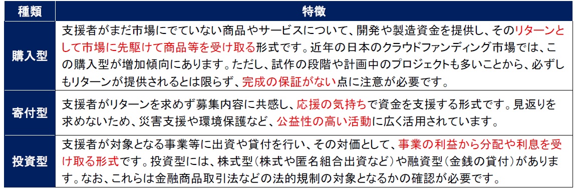 クラウドファンディングは、代表的なものが3 つあり、それぞれの特徴は以下の通りです。