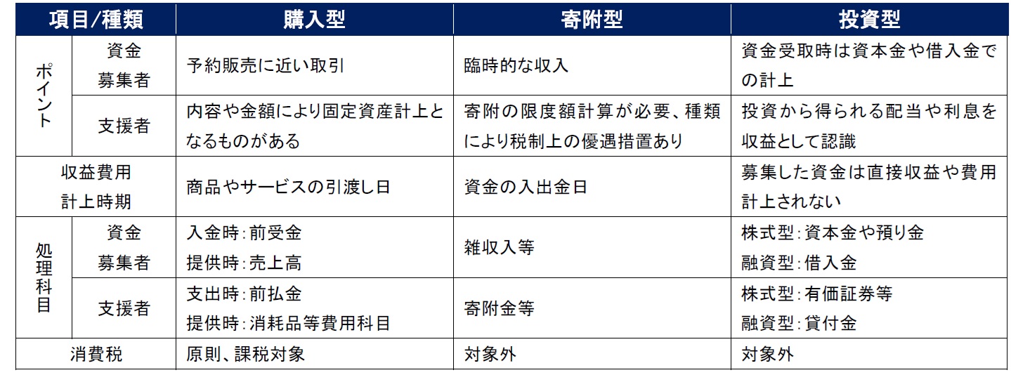 クラウドファンディングの種類に応じて、そのポイントや収益費用の計上時期、会計処理上の勘定科目、また消費税の取扱いなどは異なります。