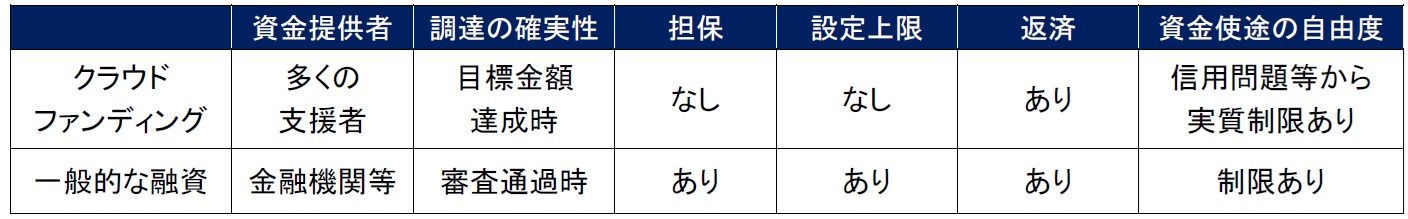 A.クラウドファンディングは、基本的に資金の上限や担保の設定が不要であり、また、銀行等の貸主からの審査がなく、多くの支援者から小口で融資を受けるところが異なる点となります。