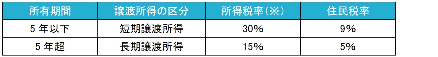譲渡所得は、取得した日から譲渡した年の 1 月 1 日までの所有期間が5 年以下の場合は「短期譲渡所得」となり、5 年を超える場合には「長期譲渡所得」に区分されます。