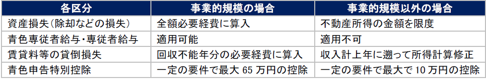 不動産所得を計算するにあたっては、その不動産賃貸事業の規模が事業的な規模で行われているかどうかによって次のように取り扱いが異なります。なお、事業的規模の判定については、原則として独立家屋が5棟以上または独立した室数が10室以上を基準に判定します。