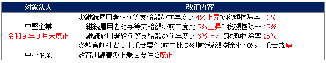 今年度の税制改正により、賃上げ促進税制は対象企業を絞り込む形で見直されました。全企業※向けの制度は令和8年3月末で廃止され、中堅企業※についても令和8年度は賃上げ率などの要件が見直されたうえで、令和9年3月末までの時限措置とされています。一方、中小企業※向けの制度は継続され、税額控除は引き続き適用可能です。ただし、人材育成への取組としての教育訓練費の上乗せ要件は廃止されました。