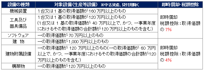 本制度は、国内での大規模かつ高付加価値な設備投資を後押しすることを目的としており、投資計画全体で35億円以上(中小企業者については、5億円以上)の設備投資が対象となります。対象設備は、生産性向上に資する以下(2)の資産です。取得年度に全額費用化できる即時償却、または法人税から控除する税額控除のいずれかを選択できます。なお、控除税額は、法人税額の20%を上限とし、控除限度超過額は一定の要件を満たせば3年間の繰越しが可能です。中小企業経営強化税制などと比較して法人の規模に制限がなく、かつ、全業種を対象としている点が特徴です。 制度利用には、事前に経済産業大臣の確認を受けることが必須であり、その投資期間中は、地域未来投資促進税制等の一定の投資税制との併用ができない点には注意が必要です。