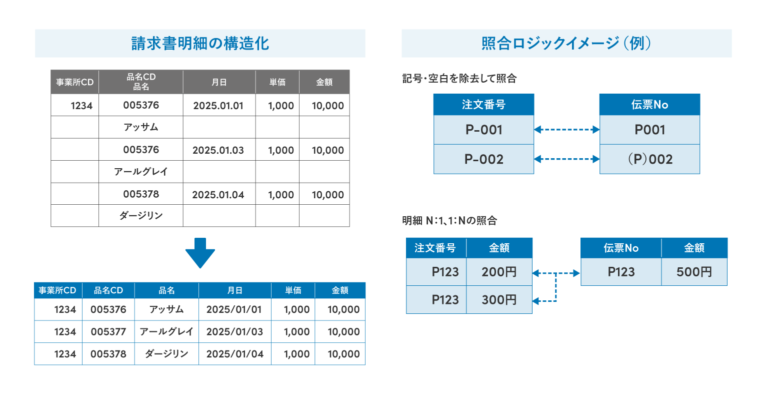 本機能の実現には、照合作業に適した形で、請求書の内容を明細単位で構造化してデータ化する技術と、多様な照合パターンが存在する複雑な条件下でも正しく照合する仕組みが必要です。構造化とは、AIがデータの意味を理解できるように情報を整理することです。Bill Oneは、40年以上にわたり自然言語処理の研究・開発を続けているグループ会社の株式会社言語理解研究所(以下、言語理解研究所)との共同開発により、請求書の明細を構造化してデータ化することを実現しました。