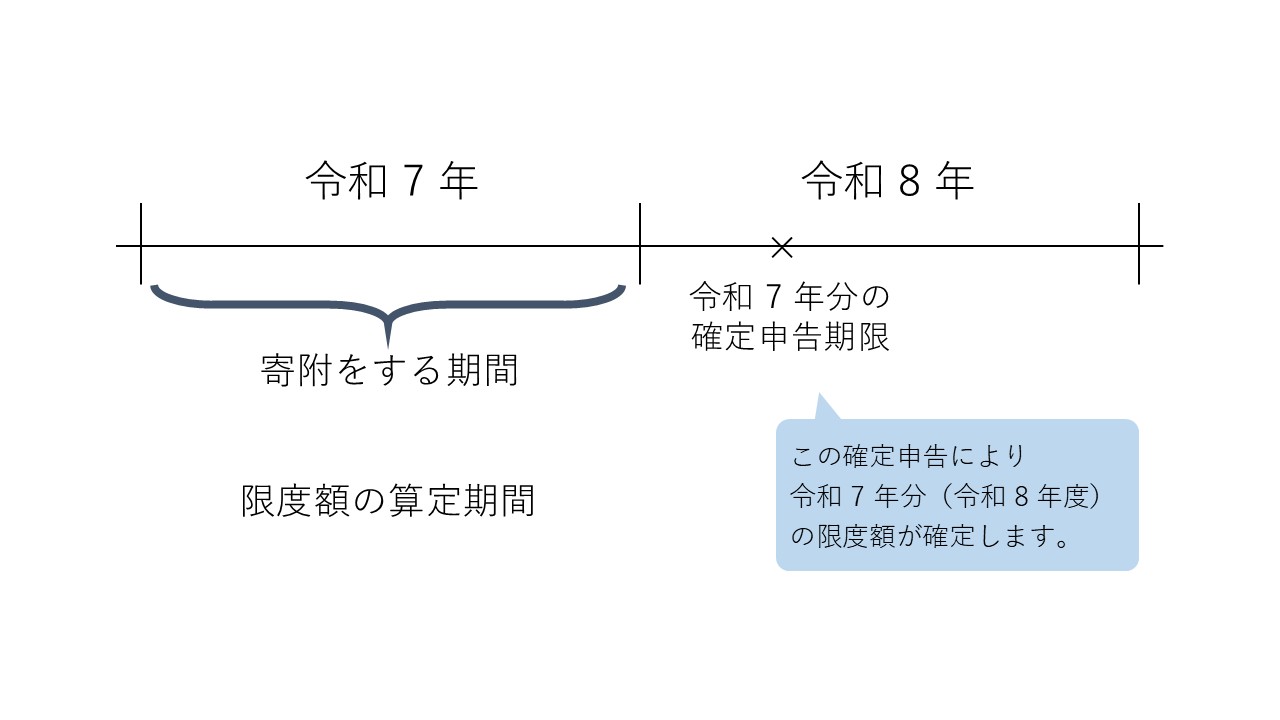 例えば下記の図のように令和7年にふるさと納税をした場合、寄附自体は令和7年中に行いますが、実際の所得税額や住民税額の計算についてはその翌年の令和8年にならなければ確定することができません。つまり、時間的に先に納税があって、後で減税額が確定するのです。したがって、最適な寄附の金額としての限度額の計算は、寄附する時点では予想でしか計算することができないということに注意が必要になります。